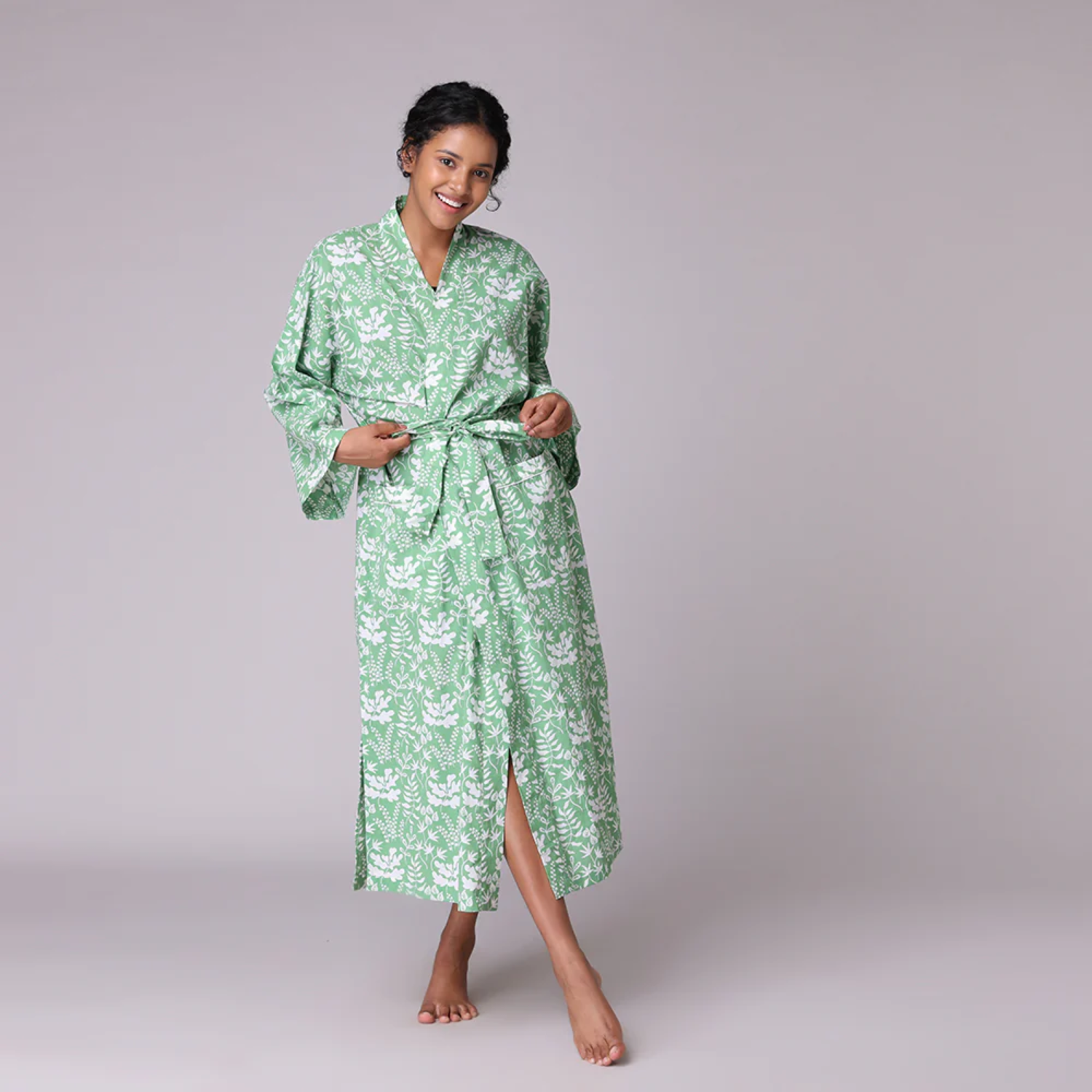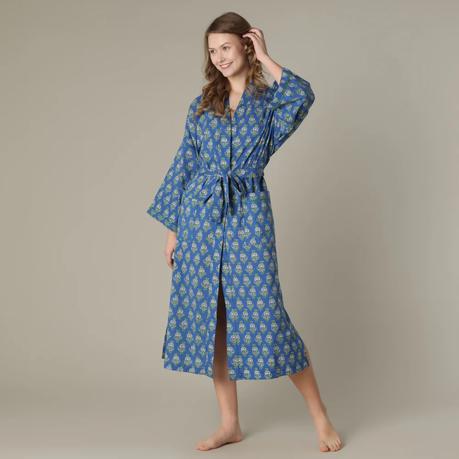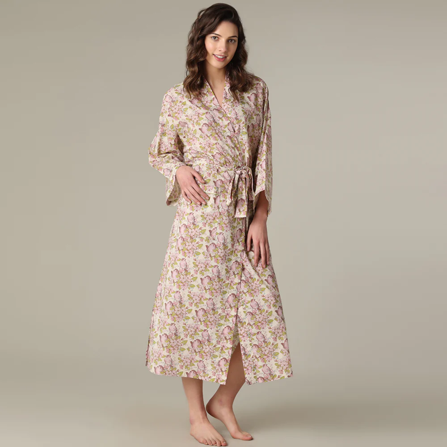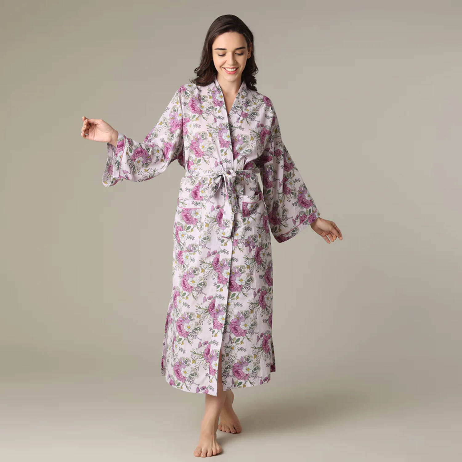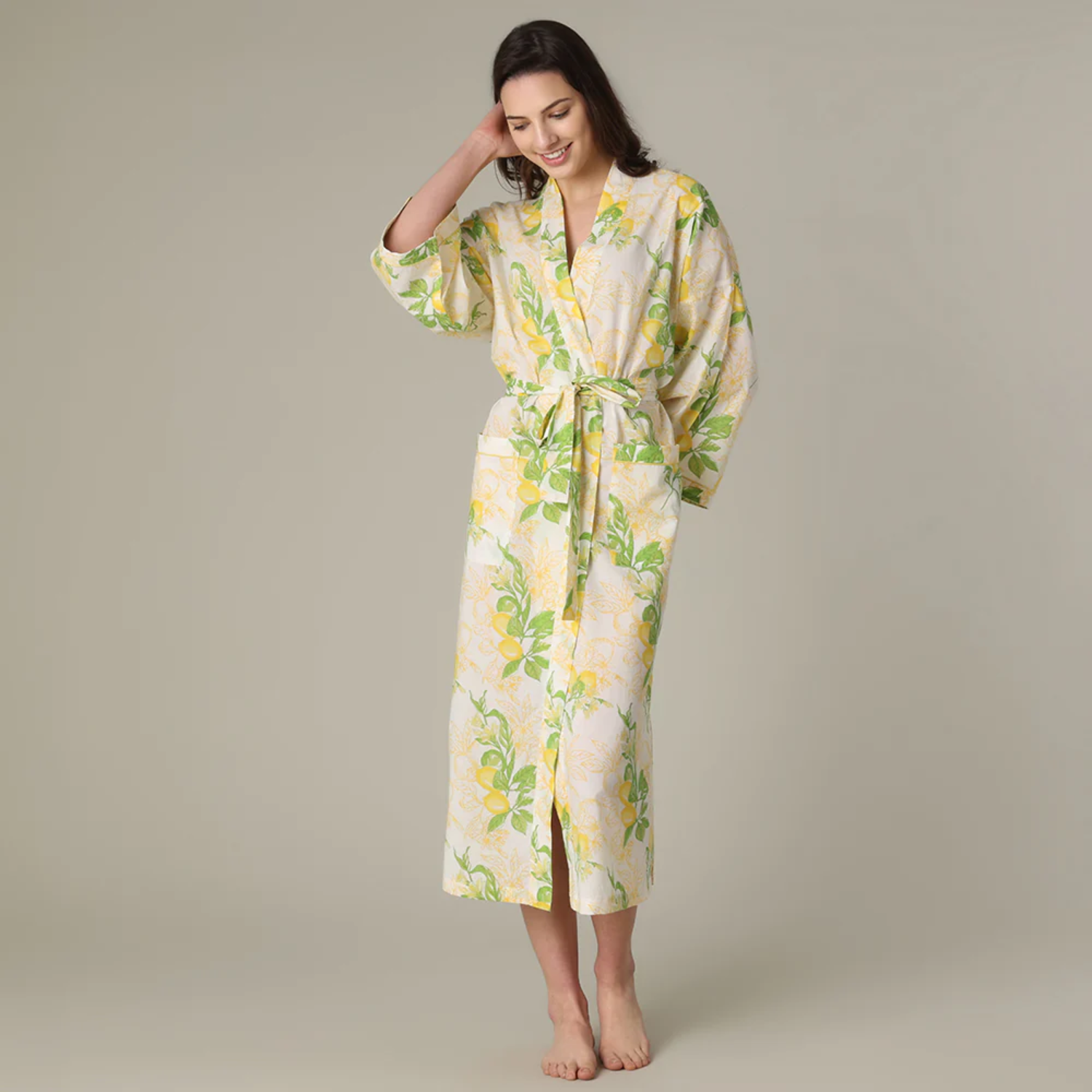 Easy like a Sunday morning. These fun, printed bathrobes are made from 100% cotton making them light and breezy for sticking on around the house! And it even comes with pockets - our prayers have been answered! This calf length kimono style robe features side slits for added comfort.