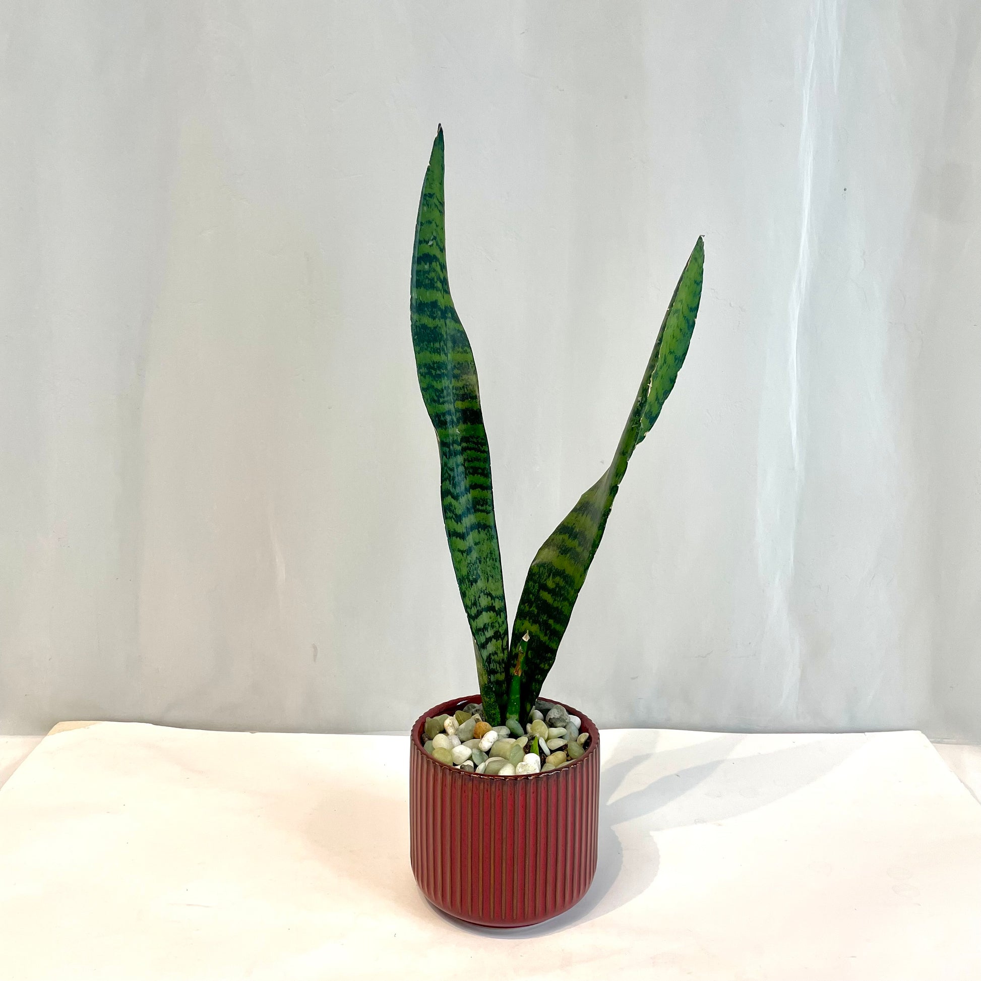 This sleek Snake Plant Sansevieria is potted in a ribbed ceramic pot and topped with decorative stones. Available in three pot colours.