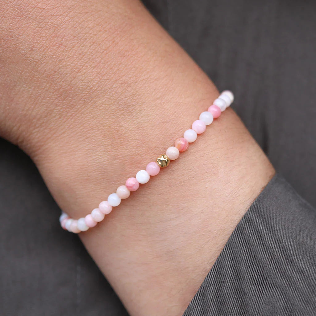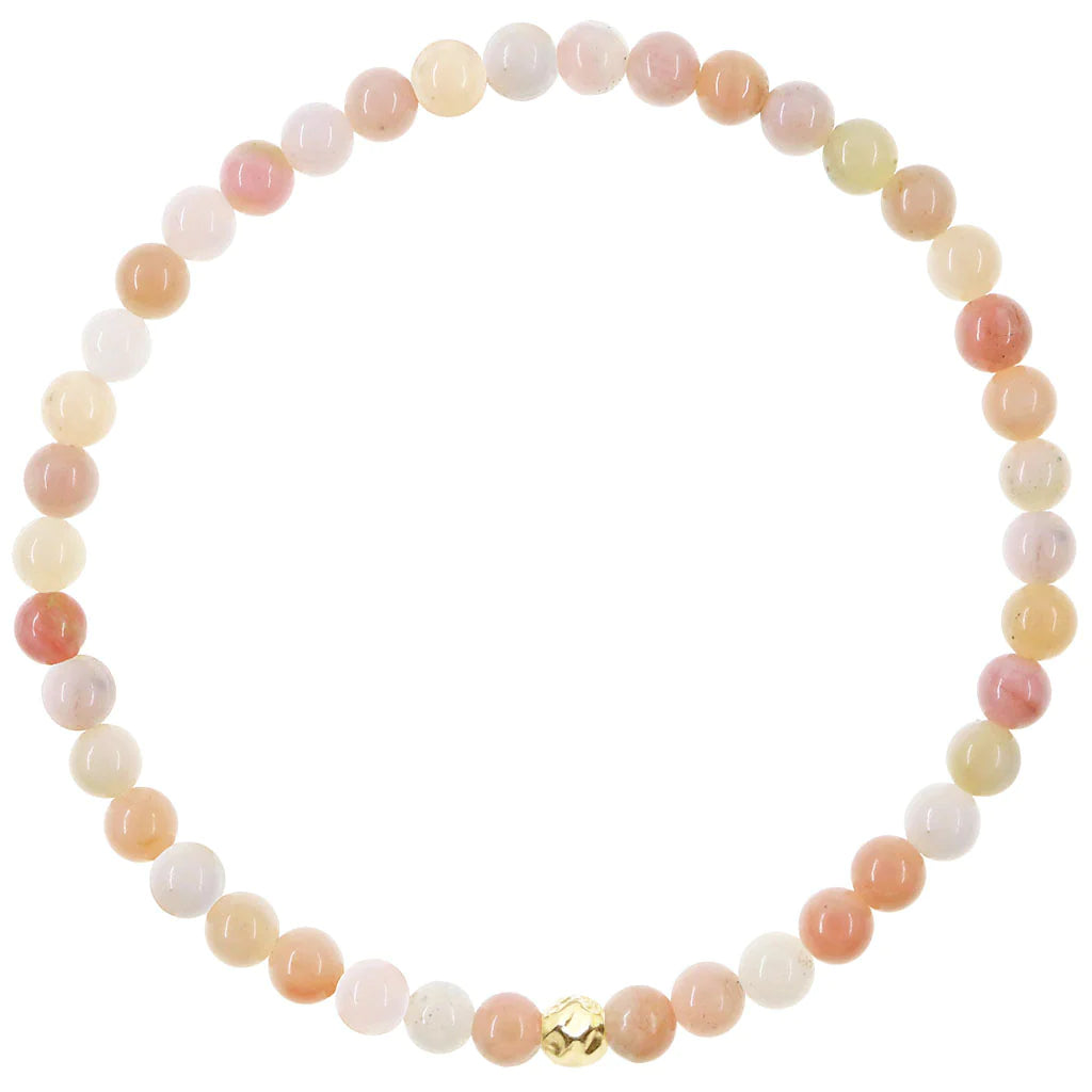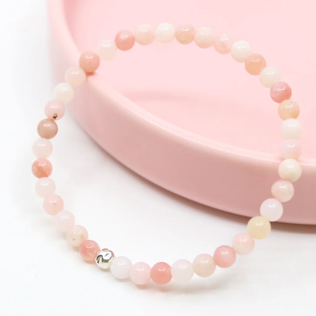 Dainty gemstone bracelet with mindfully hand-selected round natural pink opal crystals. Accented with a precious metal hammered sphere.