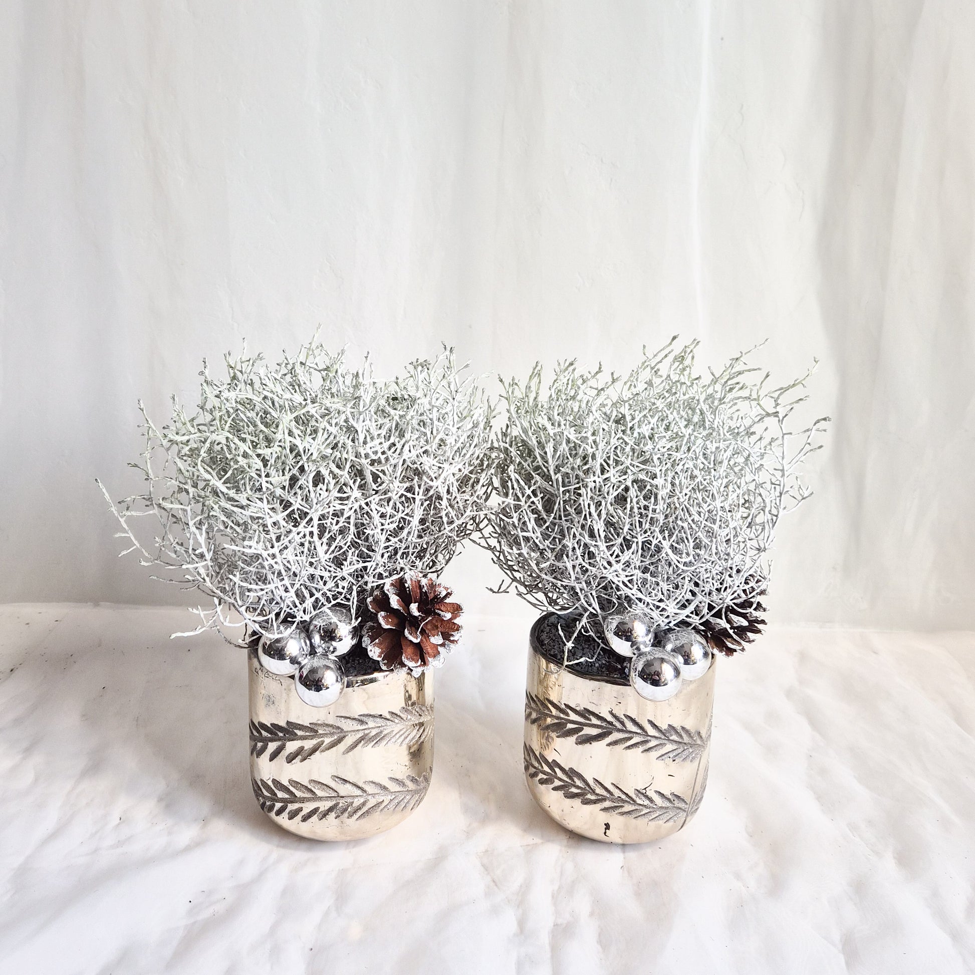 This little planter features a Silver Bush plant in an antique silver pot with glittery branch details, topped with a silver bauble cluster, glitter pinecone, and silver deco sand. Cute, simple, and wintery!