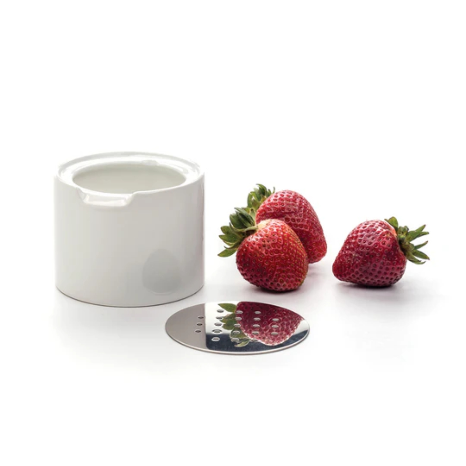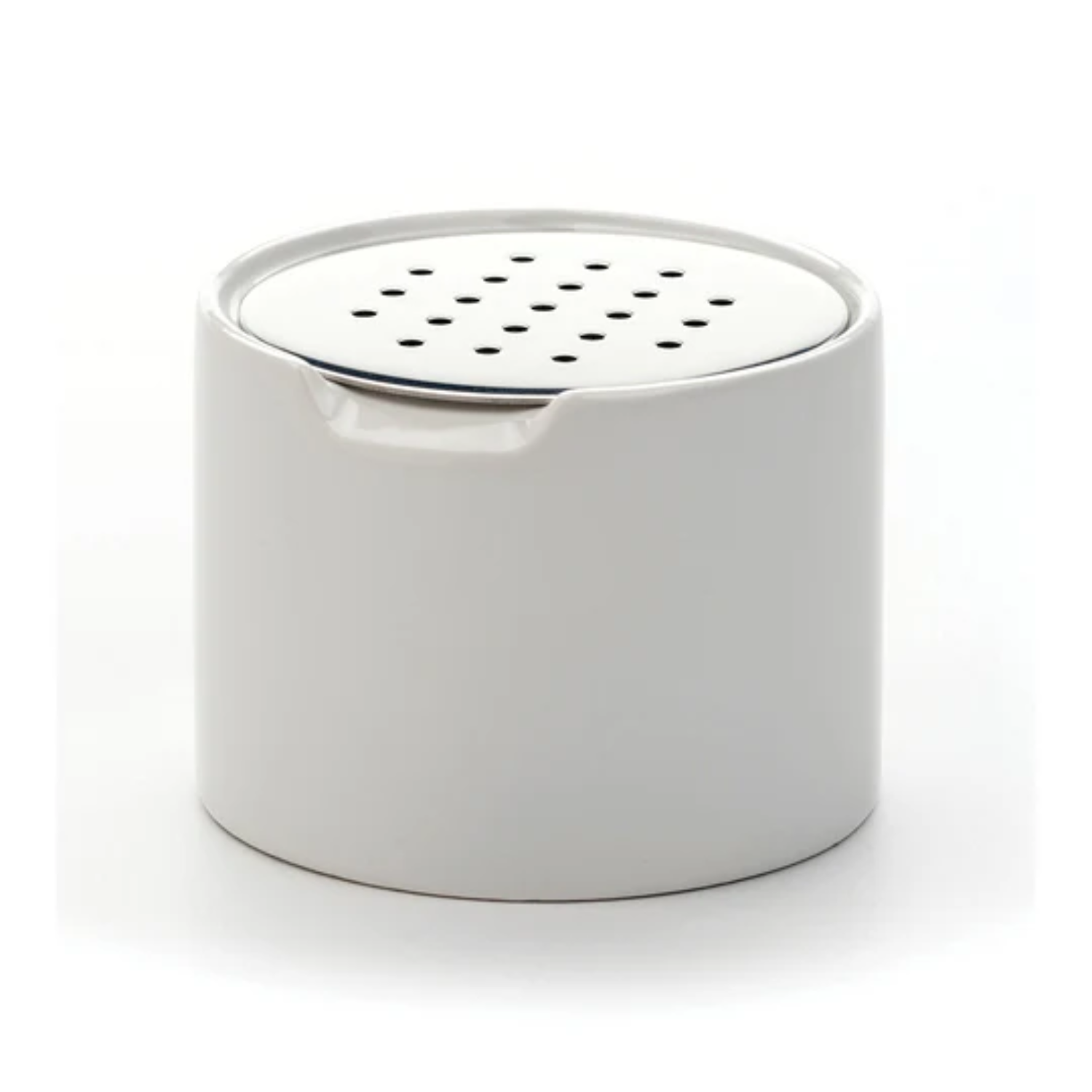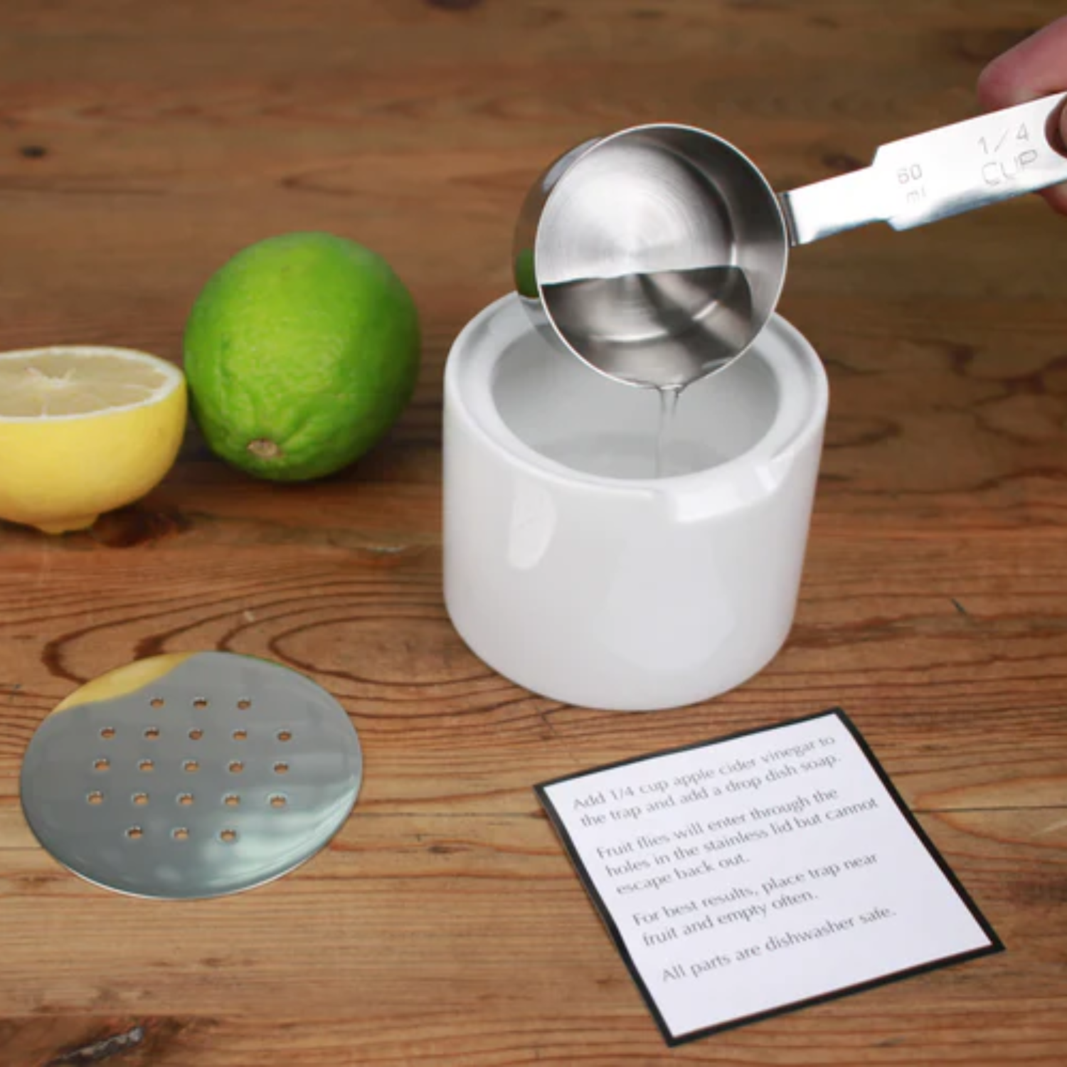Keep pesky fruit flies at bay with this discreet and effective fruit fly trap. Made of durable ceramic and 18/8 stainless steel, it blends seamlessly into your kitchen decor while doing the hard work of trapping unwanted pests. Simply follow the included instructions by adding apple cider vinegar and a drop of dish soap and place the trap near your fruit bowl for best results. All parts are dishwasher safe for easy cleanup.