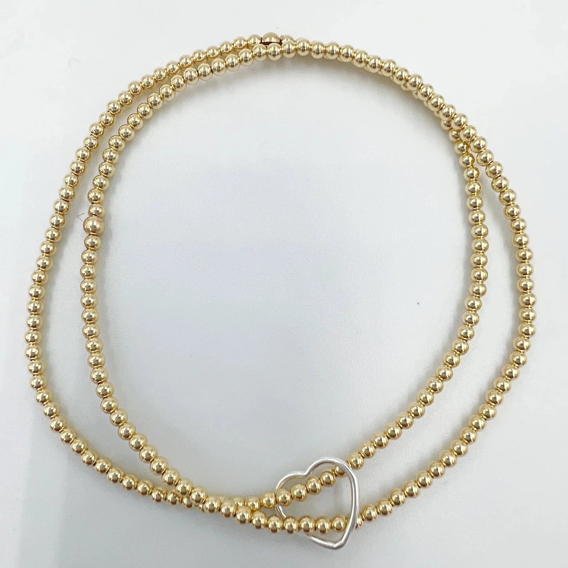 Two 2mm 14k gold filled beaded bracelets held together by a sterling silver heart.