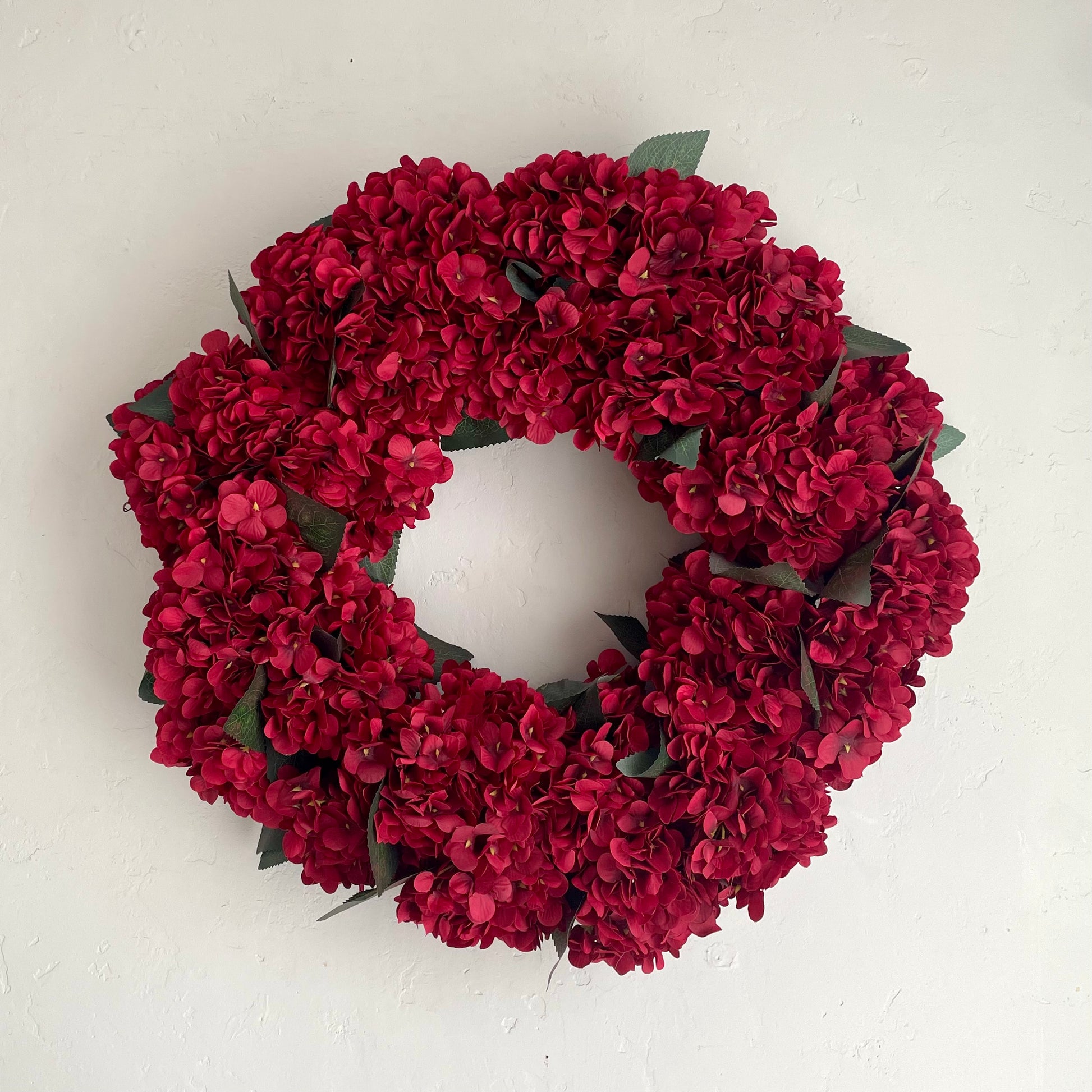 Gorgeous ruby red hydrangea blossoms make up this artificial seasonal wreath.