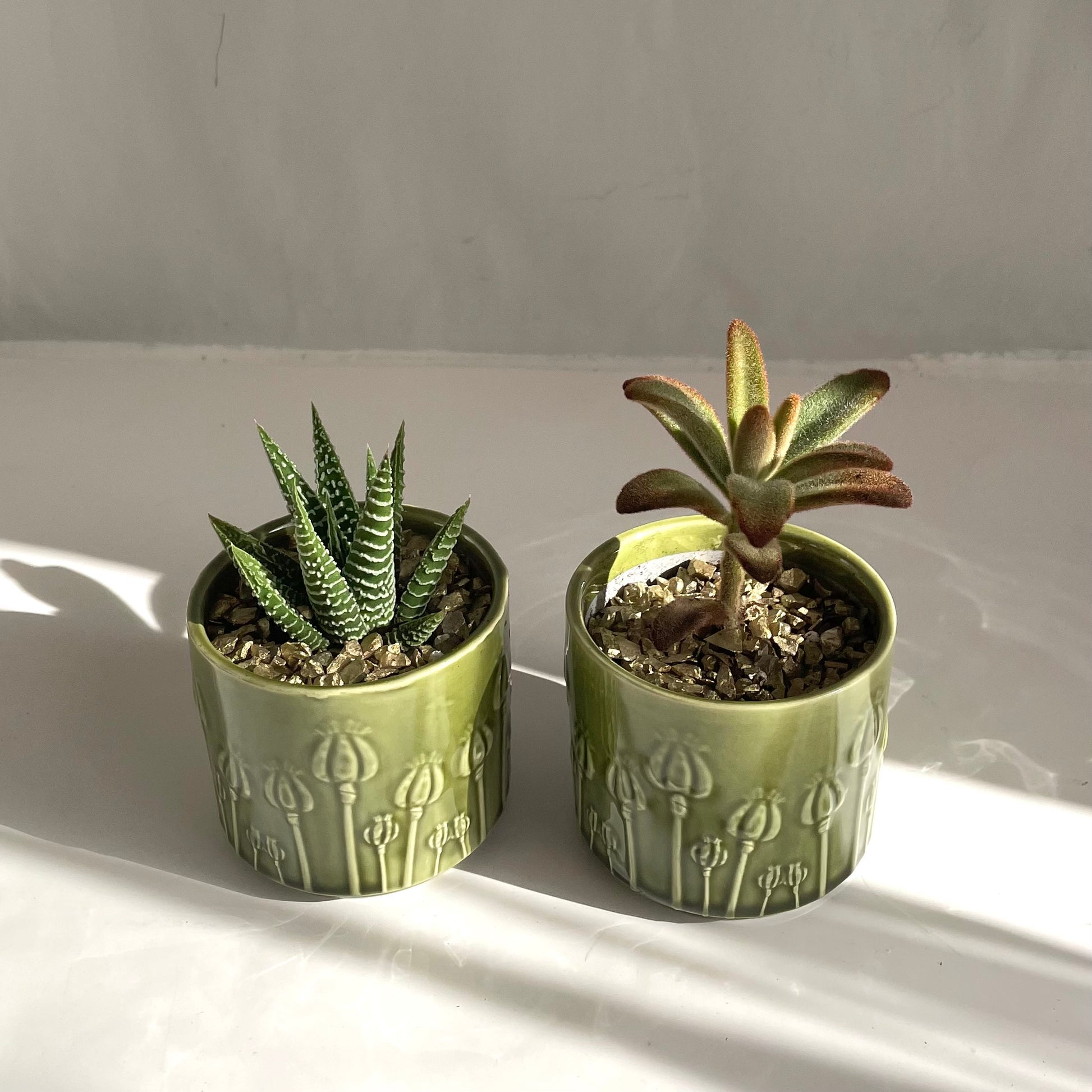 These adorable succulents are small and easy to take care of - great for beginners! Each plant is potted in an embossed green ceramic pot and topped with decorative gold stones.