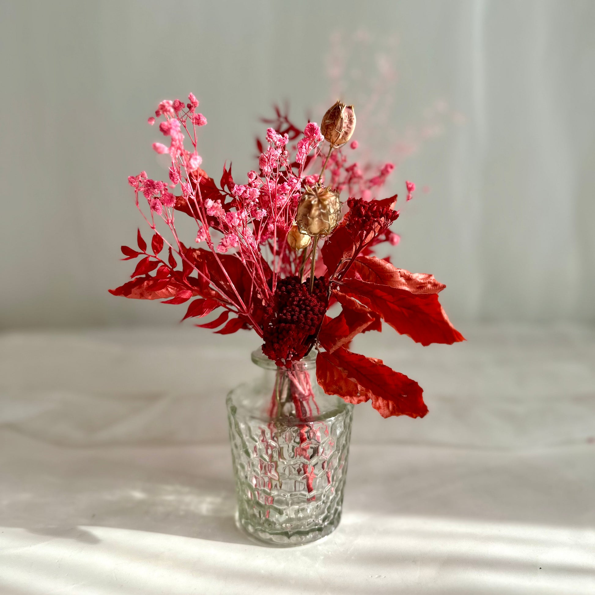 Say Happy Valentine's with an everlasting arrangement featuring red, copper, and bright pink elements. Designed in a glass bud vase. These are a one-of-a-kind arrangements, so hurry whilst stocks last!