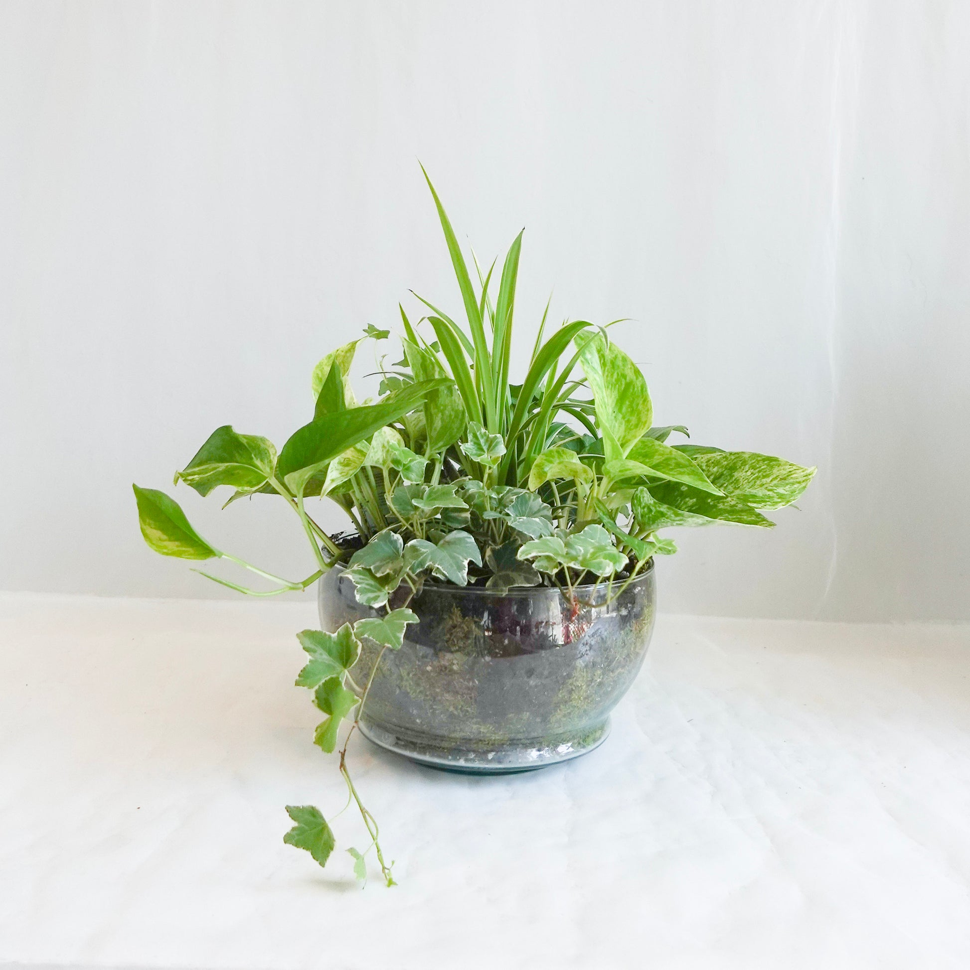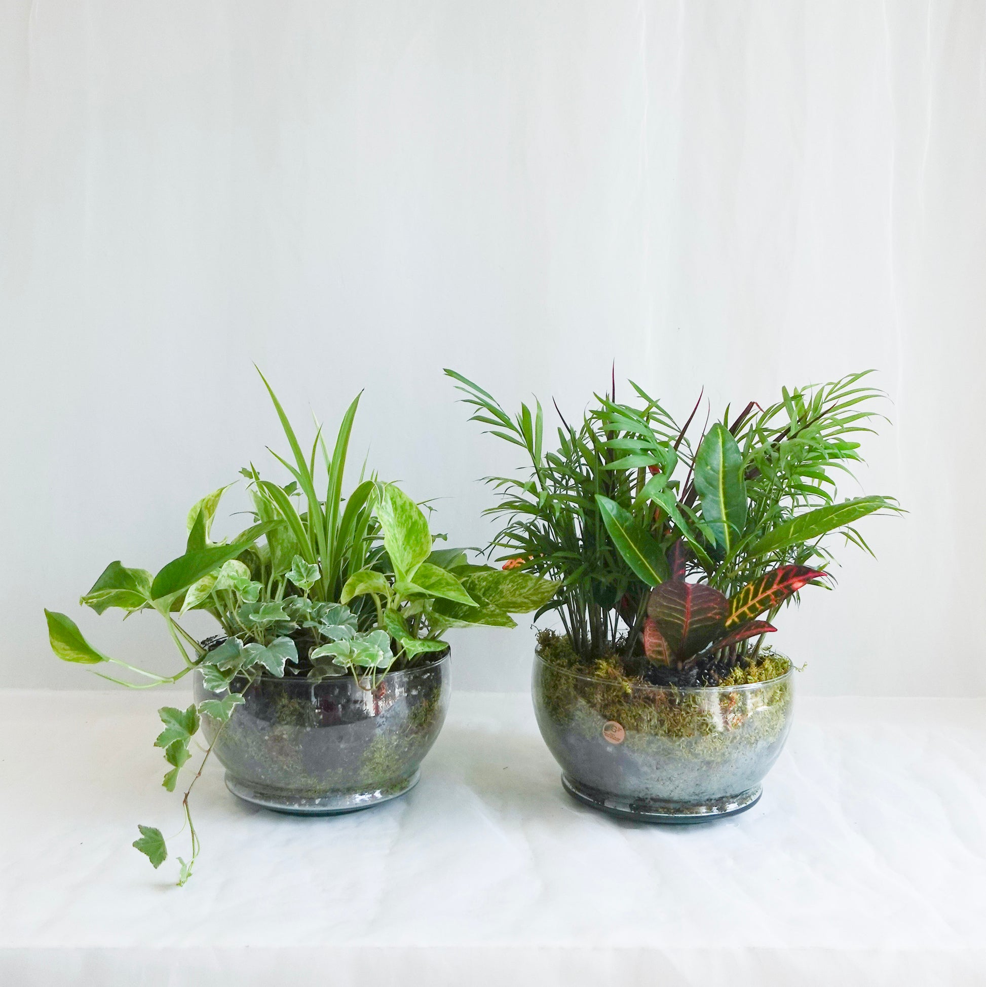 A beautiful mix of tropical plants, placed in a glass bowl and lined with moss. Choose between our colourful option or for something neutral