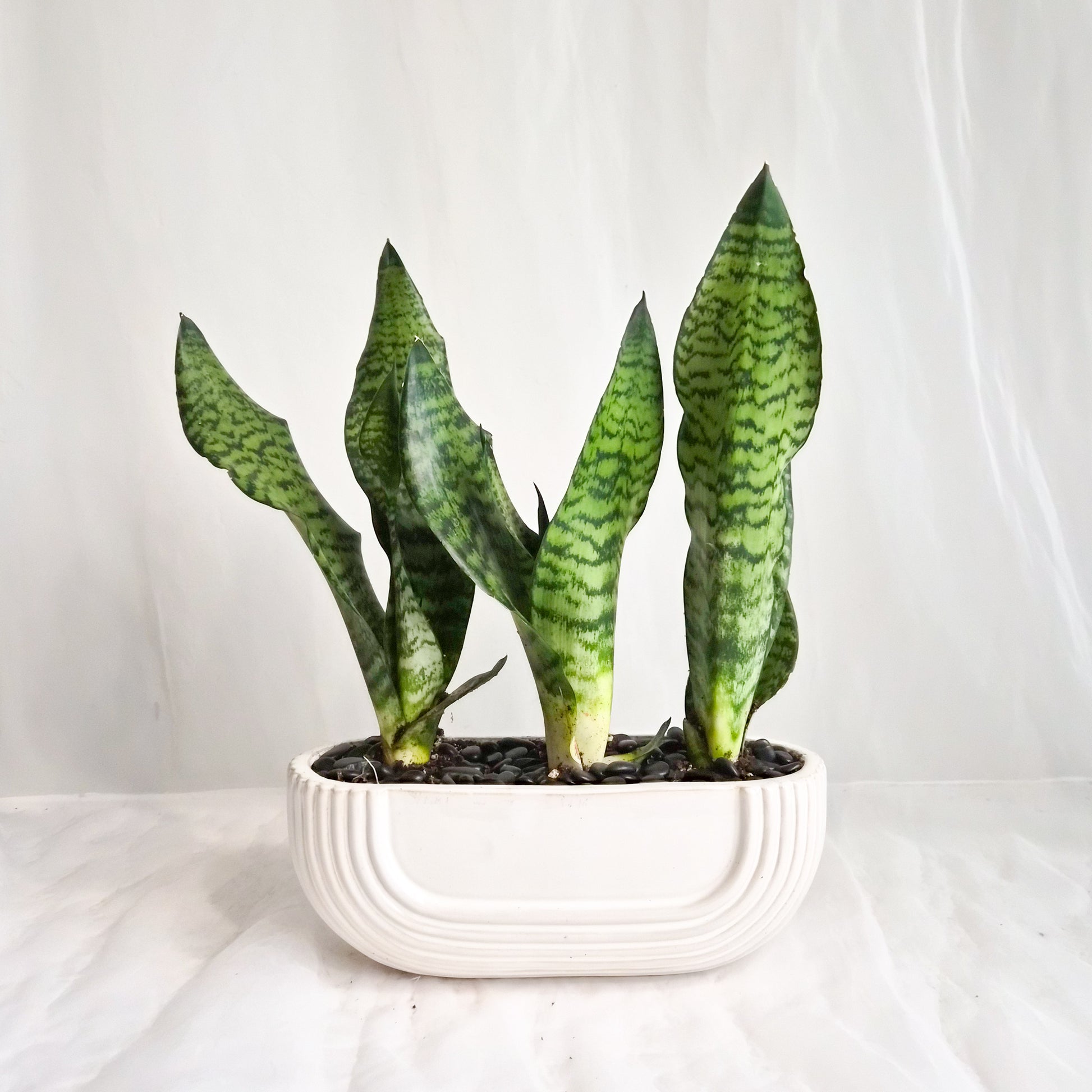 This beautiful planter features three Sansevieria planted in an embossed cream pot, and topped with decorative black stones.