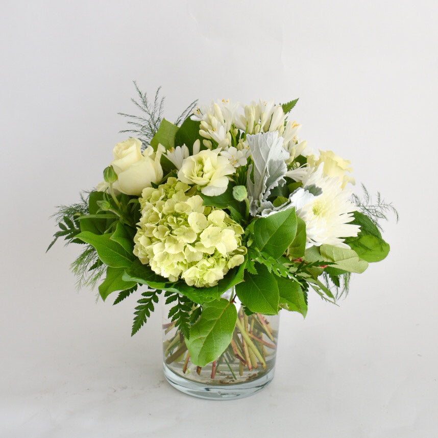 The most popular choice by customers online and in-store! Always elegant, white and green flowers really can work for all occasions. Our classic signature arrangement is designed with a low and full profile, in a clear glass vase, and features a lovely selection of white and green seasonal flowers.