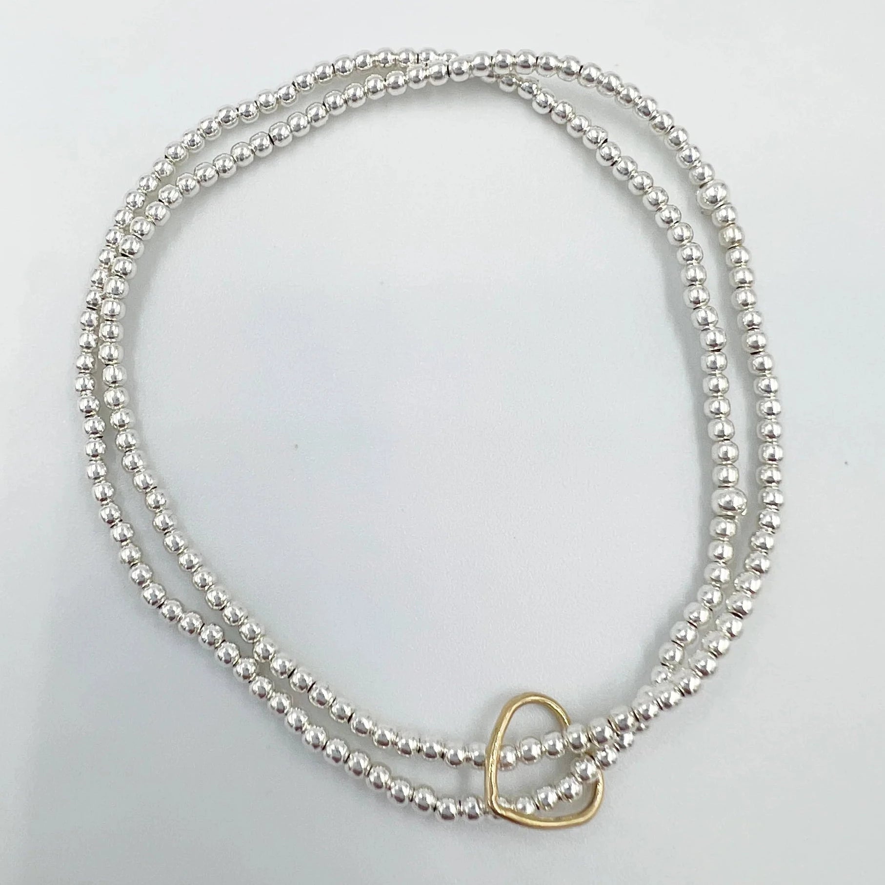 Two 2mm Sterling silver beaded bracelets held together by a 14k gold filled heart.