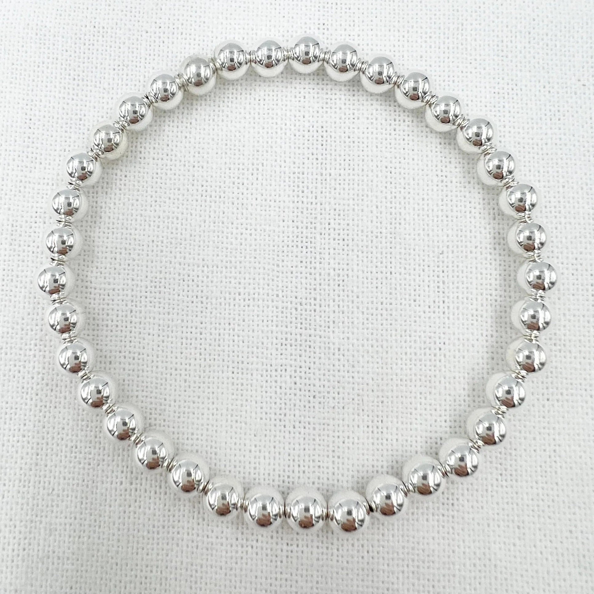 Sterling Silver 6mm beads strung on stretchy cord. Gorgeous on its own or layered. And can be left on indefinitely!