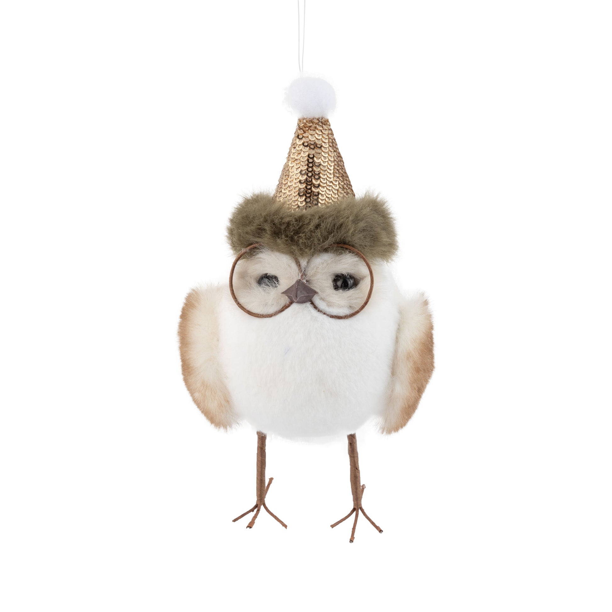 Decked out in its festive bronze sequined hat, this sweet bespectacled owl is ready for your tabletop winterscape!